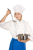 portret młodej gotować atrakcyjne kobiety w mundurze z patelni smak