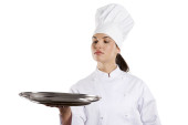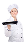 młody kucharz atrakcyjna kobieta w mundurze z patelni teflonowej