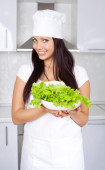 młody kucharz atrakcyjna kobieta w mundurze z świeże sałatki na białym tle