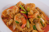 Tom Yam kung Spicy Thai zupa z krewetkami, owoce morza, mleko kokosowe i papryka chili w przestrzeni kopia miski