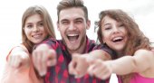 facet i dwie dziewczyny siedzą na kanapie i patrząc w górę