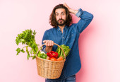 Młody człowiek zbierający organiczne warzywa ze swojego ogrodu, odizolowany, wskazując na bok.