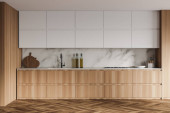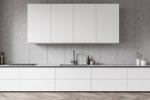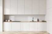 Zdjęcie "Wnętrze nowoczesnej kuchni z białymi ścianami, drewnianą podłogą i białymi szafkami i szafkami. 3d renderowanie" może być wykorzystywane do celów osobistych i komercyjnych zgodnie z warunkami zakupionej licencji Royalty-free. Obraz jest dostępny do pobrania w jakości wysokiej rozdzielczości do 5760x3840.