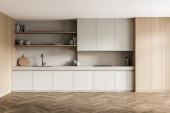 Wnętrze nowoczesnej kuchni z białymi ścianami, drewnianą podłogą i białymi szafkami i szafkami. 3d renderowanie