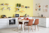 Zdjęcie "Wnętrze stylowej nowoczesnej kuchni ze stołem jadalnym" może być wykorzystywane do celów osobistych i komercyjnych zgodnie z warunkami zakupionej licencji Royalty-free. Obraz jest dostępny do pobrania w jakości wysokiej rozdzielczości do 5760x3840.