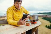 Zdjęcie "Portret młodego mężczyzny w okularach przeciwsłonecznych i lekkich ubraniach leży w czerwonym hamaku i wlewa wodę z termosu do filiżanki. Turysta używa termosu na wędrówce." może być wykorzystywane do celów osobistych i komercyjnych zgodnie z warunkami zakupionej licencji Royalty-free. Obraz jest dostępny do pobrania w jakości wysokiej rozdzielczości do 5760x3840.