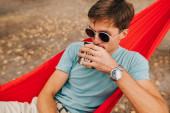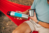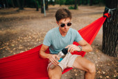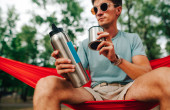 Portret młodego mężczyzny w okularach przeciwsłonecznych i lekkich ubraniach leży w czerwonym hamaku i wlewa wodę z termosu do filiżanki. Turysta używa termosu na wędrówce.
