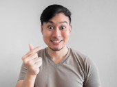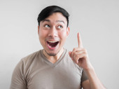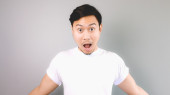Zszokowana twarz mężczyzny w szarej koszulce i szarym tle.