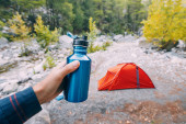 Młody człowiek siedzi na czerwonym hamaku w naturze i trzyma kubek i srebrny metalowy termos. Turysta w okularach społecznych pokazuje termos z napojem w kamerze.