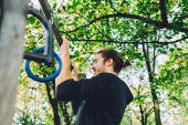 Portret mężczyzny w okularach przeciwsłonecznych i zwykłych ubraniach wisi hamak na drzewie w parku o skoncentrowanej twarzy, szydełkuje zawiesia.