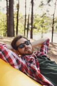Pozytywny facet w okularach przeciwsłonecznych leży w hamaku na drzewie w lesie, rozmawiając przez telefon i patrząc w kamerę z uśmiechem na twarzy.