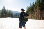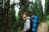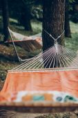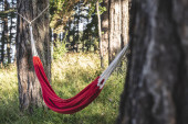 Torba podróżna leży na magicznym hamaku w lesie. Koncepcja sprzętu turystycznego. Temat zdjęcia torby w pasie na wędrówki.
