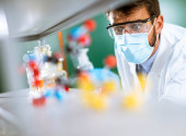 Lekarz w ochronnej masce na twarz i okularach ochronnych w strzykawce z igłą i butelce z lekiem