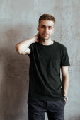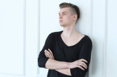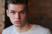 Portret młodego przystojnego mężczyzny ze stylową fryzurą pozowanie w białej koszuli