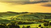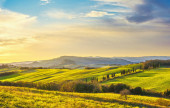 Zachód słońca na wsi Maremma. Toczące się wzgórza i cyprysowe drzewa. Bibbona. Toskania, Włochy, Europa