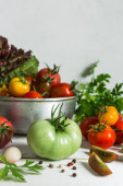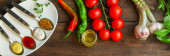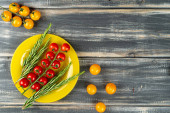 Białe drewniane tło z płytą z rozmarynem i składnikami, pomidory, pattypan squash i przyprawy, widok z góry