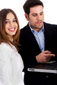 zadowolony mężczyzna i kobieta, patrząc na coś na laptopie