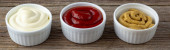 Zestaw trzech rodzajów klasycznych sosów na naturalnym drewnianym tle. Musztarda keczupu majonezowego. widok z góry z miejsca kopiowania
