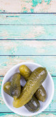 narodowa cecha jest niezdrowa: szkło fasetowe Rosyjska wódka na białym stole, kilka ogórków leżących na talerzu, wtyczka jest w pobliżu