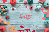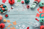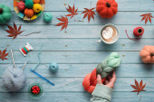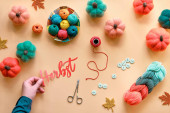 Lewa ręka na szydełku. Widok z góry drewniany stół z rękami lewej kobiety, kulki przędzy, wiązki wełny, dekoracyjne jesienne dynie filcowe i jesienne liście. Sezonowy płaski leżał na wyblakłym drewnie.