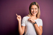 Młoda piękna blondynka w pasiastej koszulce stojąca nad odizolowanym żółtym tłem uśmiechnięta i patrząca w kamerę z dwiema rękami i palcami na boku.