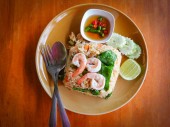 Rolka z omletem z pomidorami w plasterkach sałata warzywna na białym talerzu / jajkach omlet śniadanie i sos pomidorowy na wierzchu