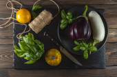 Różne surowe świeże bakłażany na desce do krojenia drewna. Koncepcja stylu życia zielonego domu i produktów rolniczych na własne potrzeby, płaskie układanie na powierzchni betonu klarnetowego, przestrzeń do kopiowania