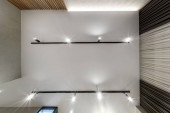 Zdjęcie "sufit podwieszany z lampami halogenowymi i konstrukcją płyt gipsowo-kartonowych w pustym pomieszczeniu w mieszkaniu lub domu. Sufit napinany biały i skomplikowany kształt." może być wykorzystywane do celów osobistych i komercyjnych zgodnie z warunkami zakupionej licencji Royalty-free. Obraz jest dostępny do pobrania w jakości wysokiej rozdzielczości do 5760x3840.