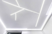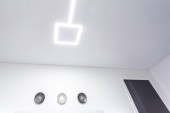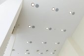 sufit podwieszany z lampami halogenowymi i konstrukcją płyt gipsowo-kartonowych w pustym pomieszczeniu w mieszkaniu lub domu. Sufit napinany biały i skomplikowany kształt.