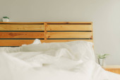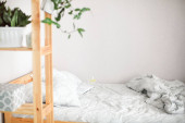 Zdjęcie "Wnętrze sypialni z drewnianymi schodami i łóżkiem na drugim piętrze ze stołem nocnym, lampą i lampą wiszącą na suficie. Nowoczesny wystrój" może być wykorzystywane do celów osobistych i komercyjnych zgodnie z warunkami zakupionej licencji Royalty-free. Obraz jest dostępny do pobrania w jakości wysokiej rozdzielczości do 5760x3840.