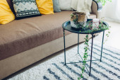Wnętrze sypialni z drewnianymi schodami i łóżkiem na drugim piętrze ze stołem nocnym, lampą i lampą wiszącą na suficie. Nowoczesny wystrój
