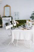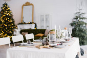 Święta Bożego Narodzenia pięknie nakryty stół w przestronnej jasnej jadalni lub salonie w domu