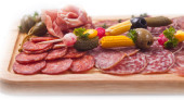 Pyszna zimna przekąska z różnymi kiełbaskami i marynowanymi warzywami na drewnianej desce odizolowanej na czarno.