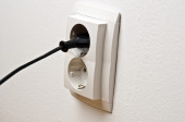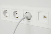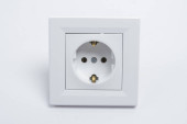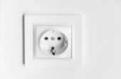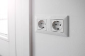 Białe plastikowe gniazdo zamontowane jest w białej ścianie. Naprawa