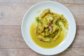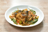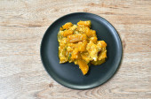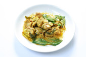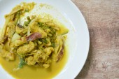 pikantna smażona kość wieprzowa z korzeniem palca w sosie curry na talerzu