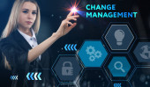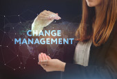 Biznes, Technologia, Internet i koncepcja sieci. Młody przedsiębiorca pracuje na wirtualnym ekranie przyszłości i widzi napis: Zarządzanie zmianą