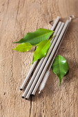 Zdjęcie "Zamknij bambusowe słomki zielonym liściem. Koncepcja ekologicznego produktu." może być wykorzystywane do celów osobistych i komercyjnych zgodnie z warunkami zakupionej licencji Royalty-free. Obraz jest dostępny do pobrania w jakości wysokiej rozdzielczości do 5760x3840.