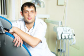 Portret szczęśliwego, przyjaznego dentysty, lekarza w klinice stomatologicznej