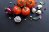 Trzy czerwone pomidory, trzy cebule i gruba sól na czarnym tle. Zbliżenie