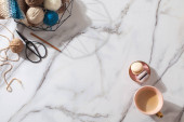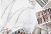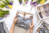 Starannie i schludnie złożone oczka w rozdzielaczu szuflady organizatora na białym marmurowym tle. Decluttering bielizny. Zorganizowana przestrzeń i przechowalnia szuflad. Przestrzeń chroniona.