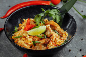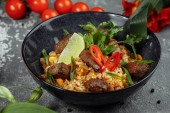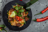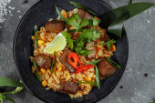 Smażony ryż z wołowiną i warzywami na szarym, teksturowanym tle.