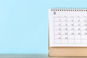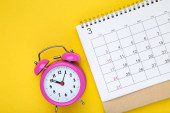 Strona kalendarza z ołówkiem i budzikiem na niebieskim tle