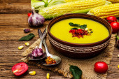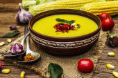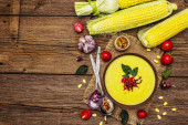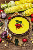 Zupa kukurydziana ze świeżymi warzywami, ziołami i przyprawami. Klasyczne jesienne gorące danie, stare drewniane deski tło, zbliżenie