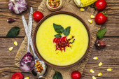 Zdjęcie "Zupa kukurydziana ze świeżymi warzywami, ziołami i przyprawami. Klasyczne jesienne gorące danie, stare drewniane deski tło, zbliżenie" może być wykorzystywane do celów osobistych i komercyjnych zgodnie z warunkami zakupionej licencji Royalty-free. Obraz jest dostępny do pobrania w jakości wysokiej rozdzielczości do 5760x3840.