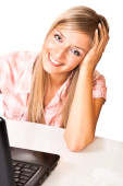 kaukaski kobieta z notebooka biały na białym tle backgrodun