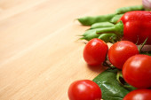 pomidory, cebulę, pieprz i czosnek na białym tle na karcie starego drewna