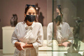 dziewczyna gość w masce antywirusowej stojącej w pobliżu zdjęć w muzeum sztuki.
