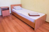 Słabe wnętrze sypialni z rzadkimi meblami i stołem komputerowym