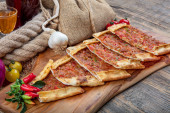 Zdjęcie "Świeżo upieczone apetyczne tureckie tortille - Gozleme ze szpinakiem na drewnianej desce i z turecką herbatą. Miejsce na tekst. Płytka głębokość pola. Ręcznie robione tureckie tradycyjne wypieki." może być wykorzystywane do celów osobistych i komercyjnych zgodnie z warunkami zakupionej licencji Royalty-free. Obraz jest dostępny do pobrania w jakości wysokiej rozdzielczości do 5760x3840.