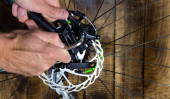 Koło rowerowe: hamulce tarczowe z bliska, szprychy. Jazda na rowerze, Hamulec naprawczy rowerów .